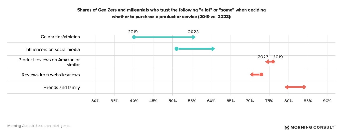 The shares of US Gen Zers and millennials who said they trust social media influencers grew from 51% in 2019 to 61% in 2023. (Morning Consult)