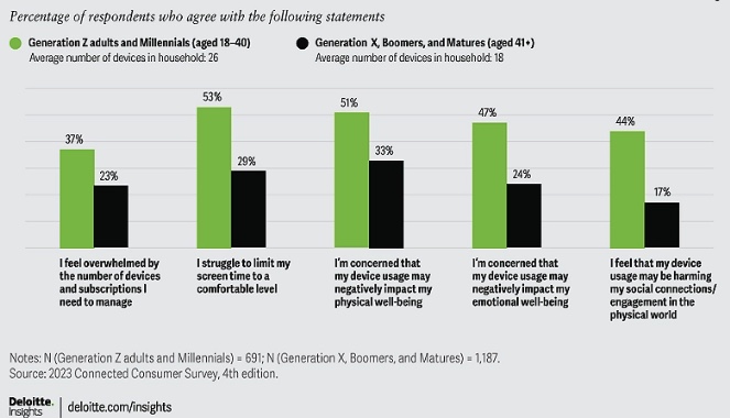 US consumers aged 18-40 are feeling more fatigued by tech and more concerned about the consequences of their device usage than older generations. (Deloitte)