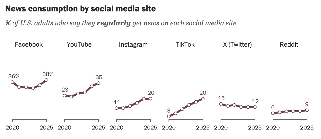 38% of US adults regularly get news updates from Facebook, followed by YouTube (36%) then TikTok (20%) and Instagram (20%). (Social Media Today)