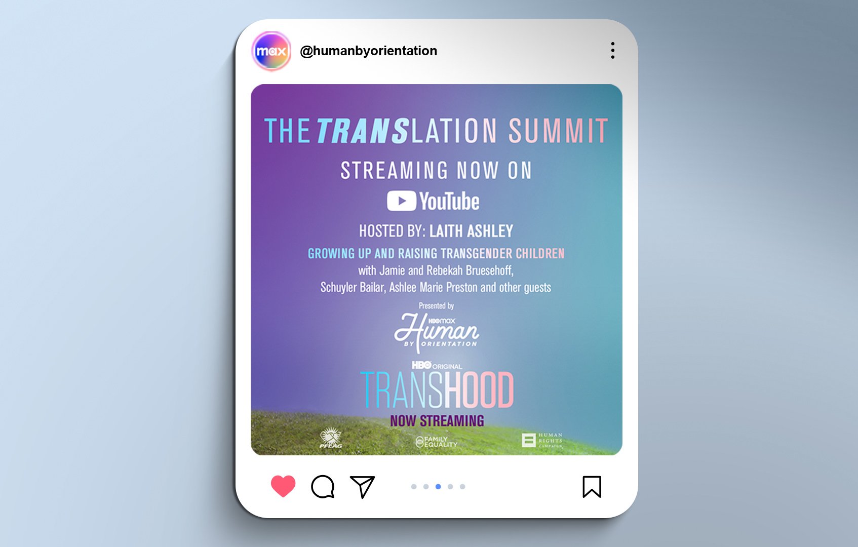 We created a COVID-safe activation to promote and act as a companion for the film Transhood. This led to the development of the TRANSlation Summit- a 3-day virtual event hosted on HBO’s YouTube channel focused on informing and educating consumers about the experience of growing up transgender and raising transgender children.